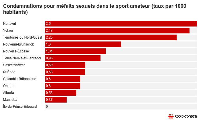 « Ça confirme nos propres chiffres, indique Sylvie Parent. Au niveau de l’abus sexuel de l’entraîneur, il n’y a pas de différence significative entre les sexes tant que ce soit les filles et les garçons, ce qui n'est pas le cas à l'extérieur du sport. C'est quand même un peu surprenant parce que, quand on regarde les statistiques en dehors du milieu sportif, les filles sont quatre fois plus à risque de vivre un abus sexuel. Par contre, en contexte sportif, ces différences ne sont plus là. » Les provinces les plus populeuses du pays sont également celles où le plus de condamnations ont été dénombrées : l’Ontario (86), le Québec (57), la Colombie-Britannique (30) et l’Alberta (23), alors que la plus petite province du pays, l’Île-du-Prince-Édouard, ne compte qu’une accusation et aucune condamnation. ![]() Cliquez pour agrandir |